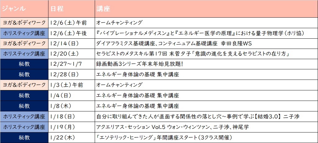 2025-10-04 / 最終更新日時 : 2025-10-05 aquarius-g エソテリック・サイエンス 【お得なセット申込】初めてでも安心!3ステップで『秘教治療』を学ぶ 初めてでも安心して学べる3ステップ 各講座詳細 A 【2025年11月~12月】入門!エソテリック・ヒーリング ガイダンス(録画配信)『秘教治療』を読むためのガイダンス講座。テキストのどこに何が書いてあるか、全体像や各論 […]