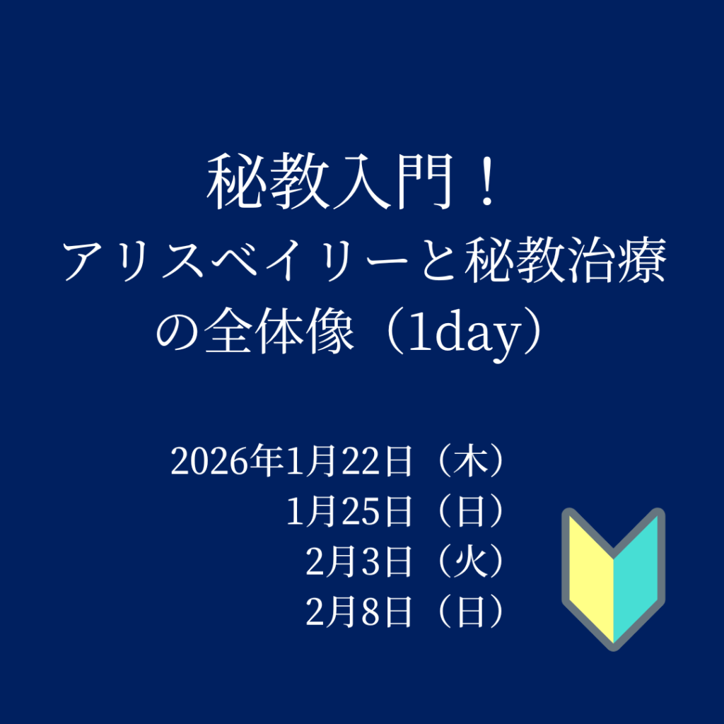 2025-12-02 / 最終更新日時 : 2026-01-09 aquarius-g エソテリック・サイエンス 【2026年1月、2月】アリスベイリーと秘教治療の全体像(1day) 『エソテリック・ヒーリング』年間講座の第1回目はライブ開催! 「すべてはエネルギーである」という観点に立った壮大な宇宙論に基づき、「エネルギー的存在としての人間およびその病気と治療のメカニズム」を解説したアリス・ベイリー […]