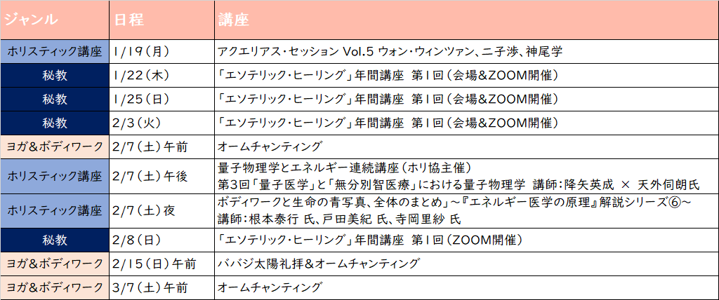 2025-11-02 / 最終更新日時 : 2025-11-02 aquarius-g エソテリック・サイエンス 【2025年12月27日~2026年1月7日】録画動画3シリーズ年末年始見放題! 3シリーズ 1.エソテリック・ヒーリング準備シリーズ 10時間・ガイダンス~『秘教治療』の読み方・チャクラ情報徹底探求 全3回※テキスト『秘教治療』上下巻[AABライブラリー]を各自ご用意ください(なくても大丈夫ですが、 […]
