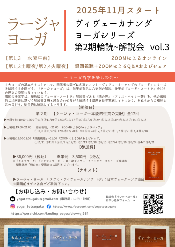 【2025年11月~2026年4月】『ラージャ・ヨーガ』輪読~解説会(ヨーガ哲学を楽しむ会主催)